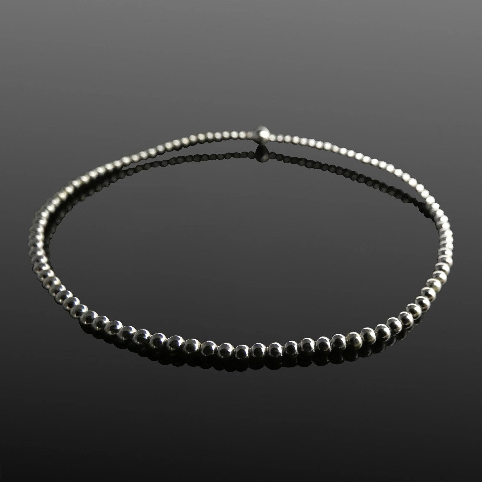 This sterling silver bracelet from our Mojo collection is strung with smooth silver beads all the way around, finished with a single larger bead as a subtle focal point. The expandable stretch design makes it easy to slip on and off, offering a comfortable, secure fit for everyday wear.