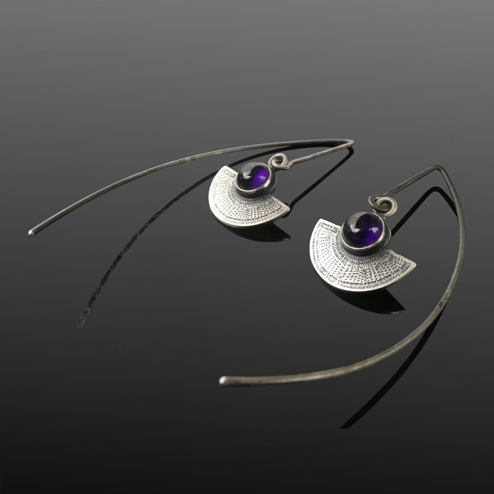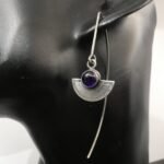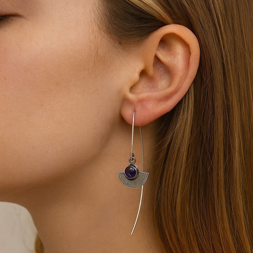 Understated but full of character, these long oxidised sterling silver earrings are all about quiet elegance. A small, circular amethyst sits just above a softly curved silver semicircle, creating a thoughtful, sculptural shape that feels both modern and timeless.