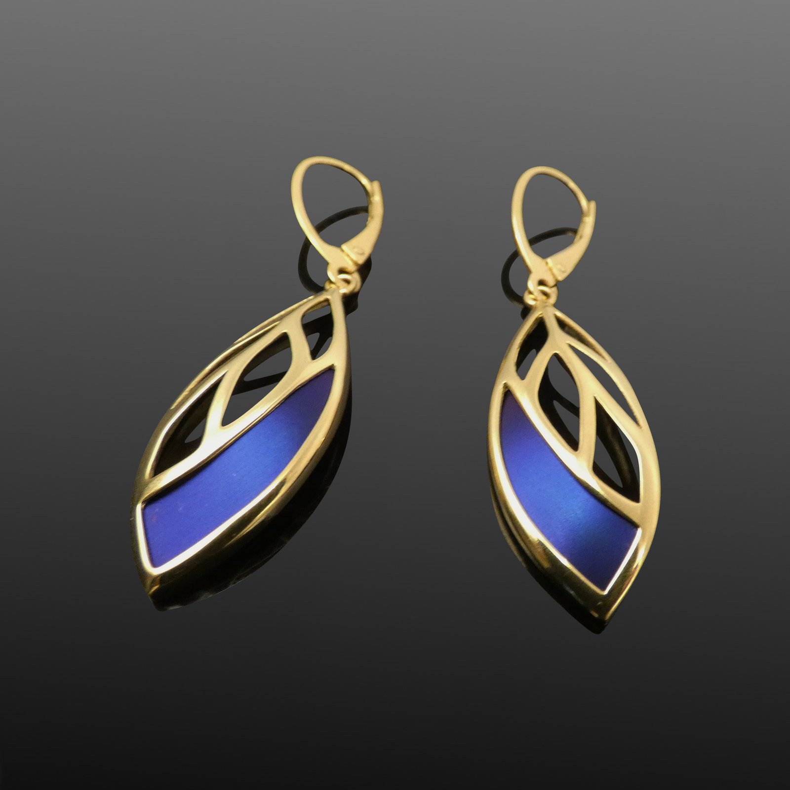These elegant almond-shaped earrings can be worn as a statement piece on their own or combined with one of our beautiful delicate titanium and gold necklaces. The unusual combination of the gold-plated silver against the blue titanium inlay is sure to catch the eye of onlookers. If you are looking for a jewellery gift for someone special, this could be the perfect choice.
