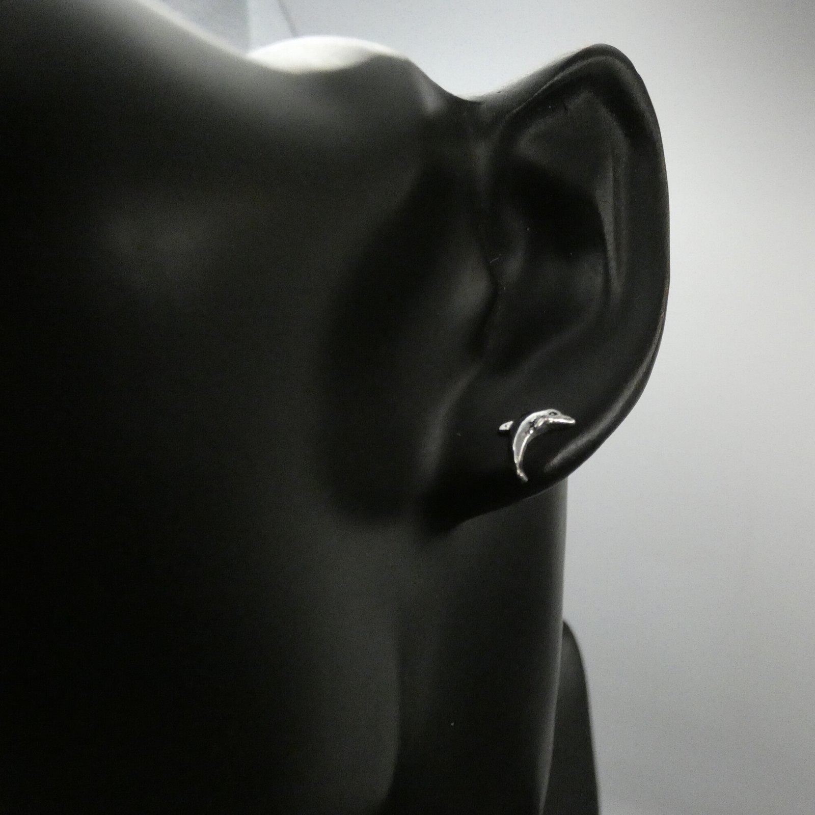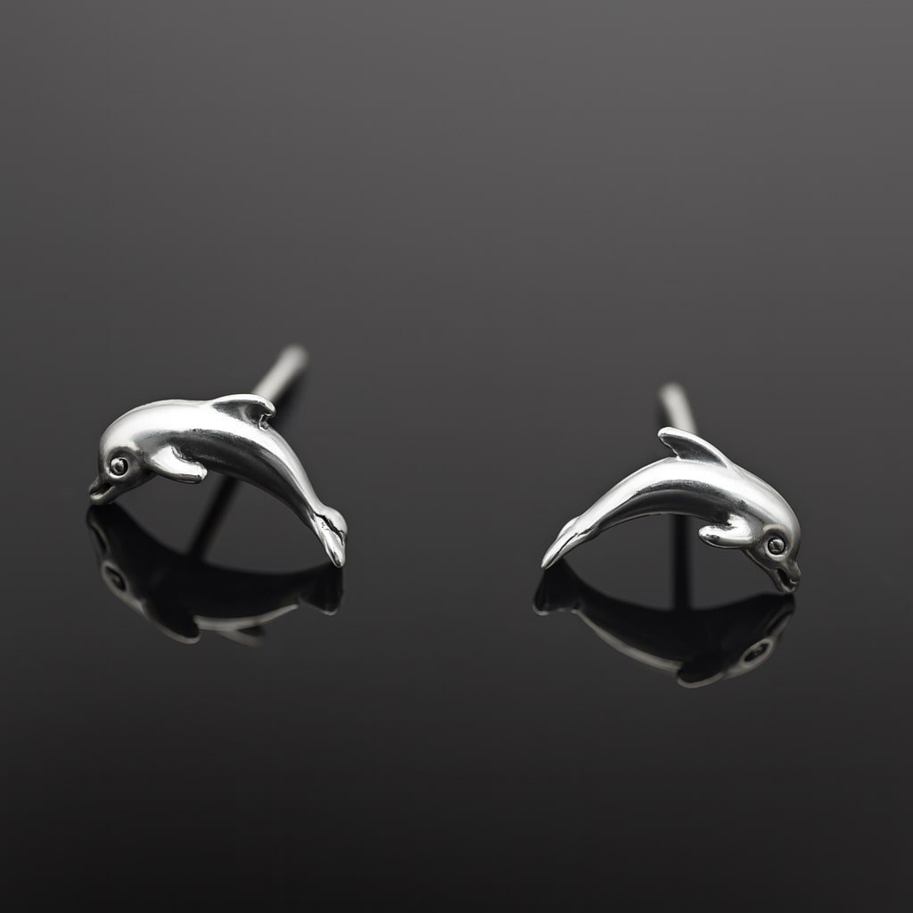 These elegant sterling silver dolphin stud earrings feature a sleek mirrored finish that catches the light beautifully.