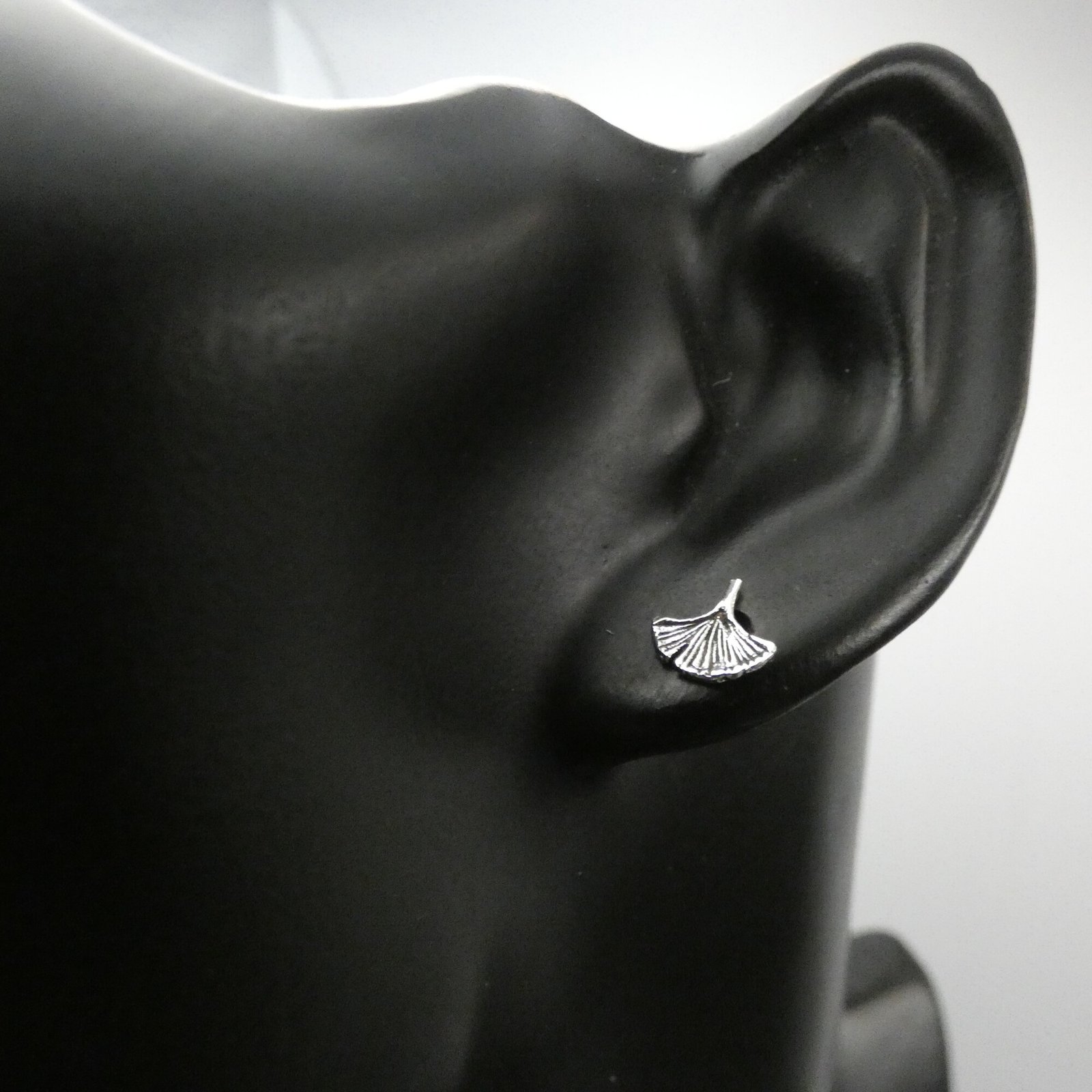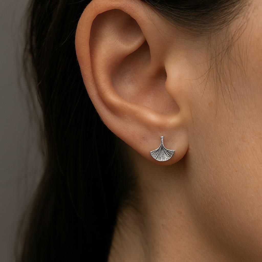Sterling silver ginkgo leaf stud earrings with an oxidised textured finish. Hypoallergenic, nature-inspired and perfect as a thoughtful gift.