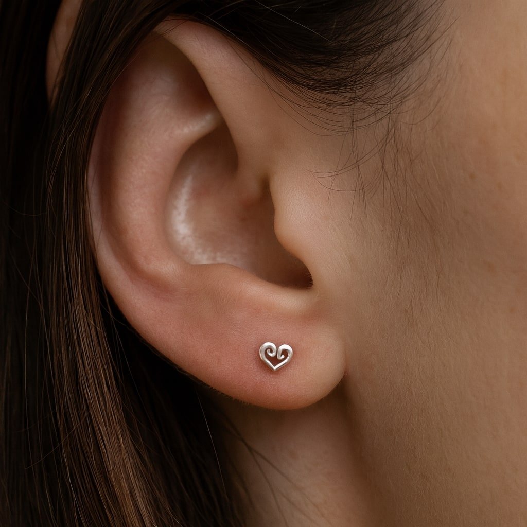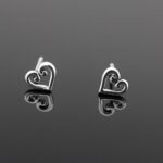 Swirly heart sterling silver stud earrings with a mirrored finish.
