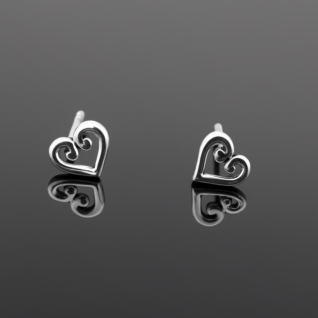 Elegant swirly heart stud earrings handcrafted in sterling silver 925 with a radiant mirrored finish.