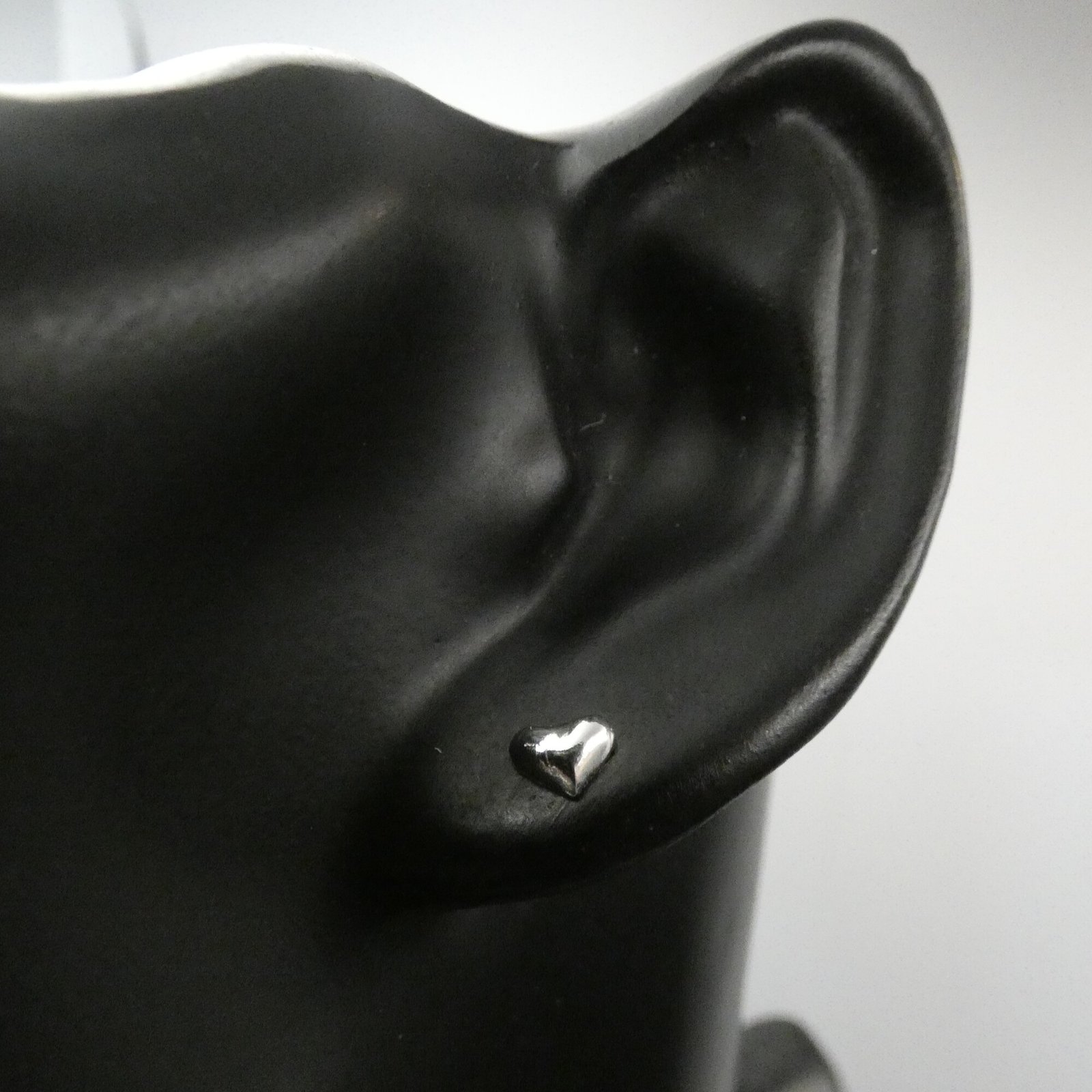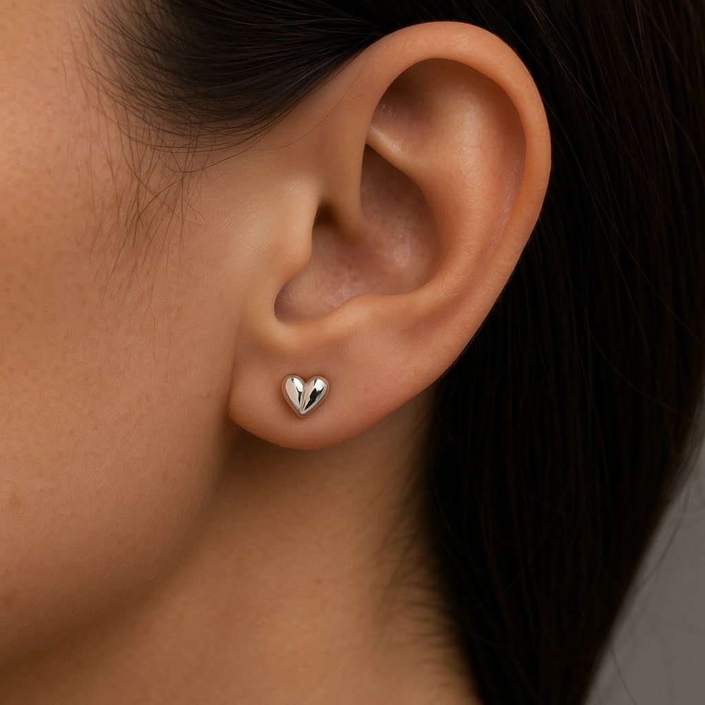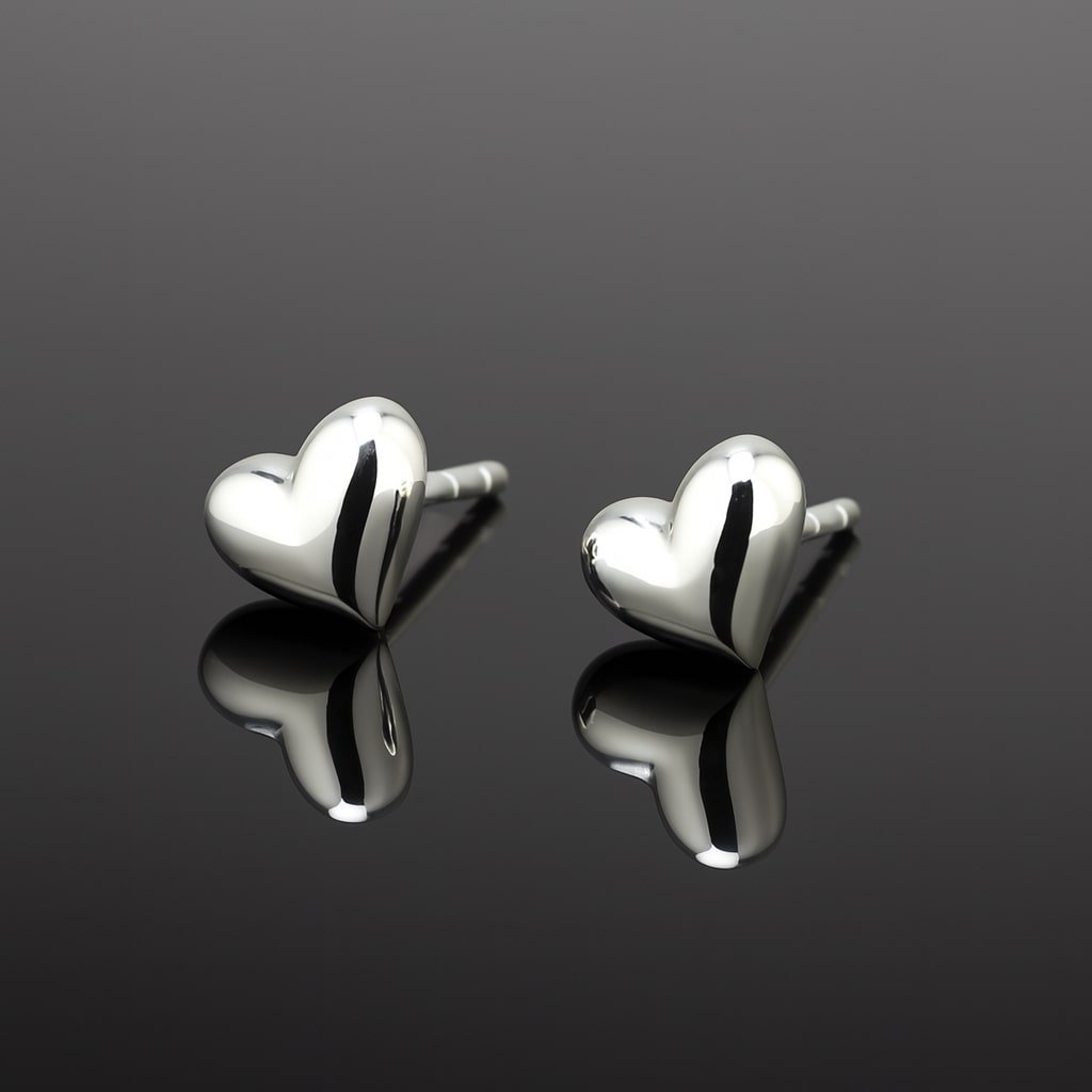 Sterling silver MOJO heart stud earrings with a mirrored finish. Hypoallergenic, stylish, and perfect for everyday wear.