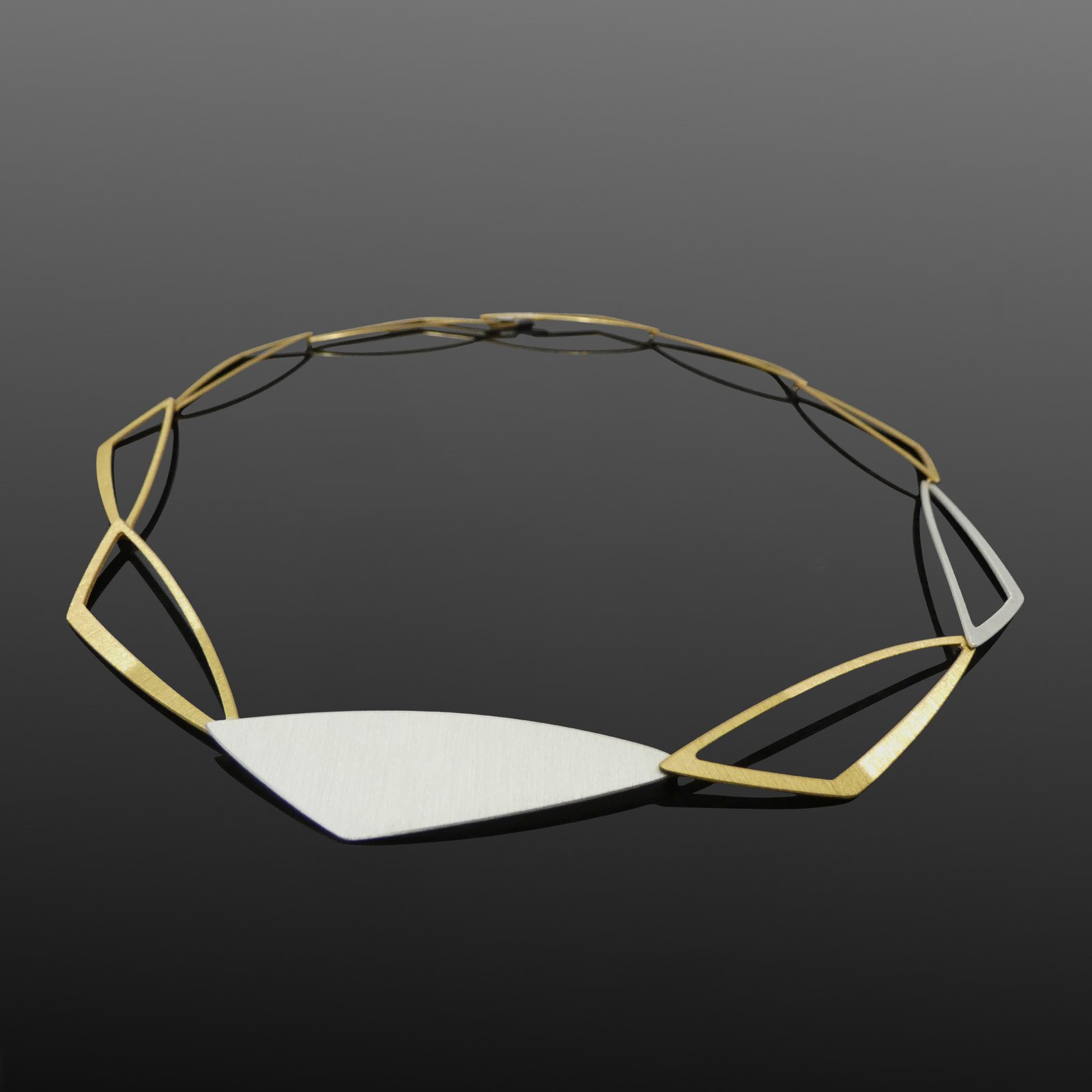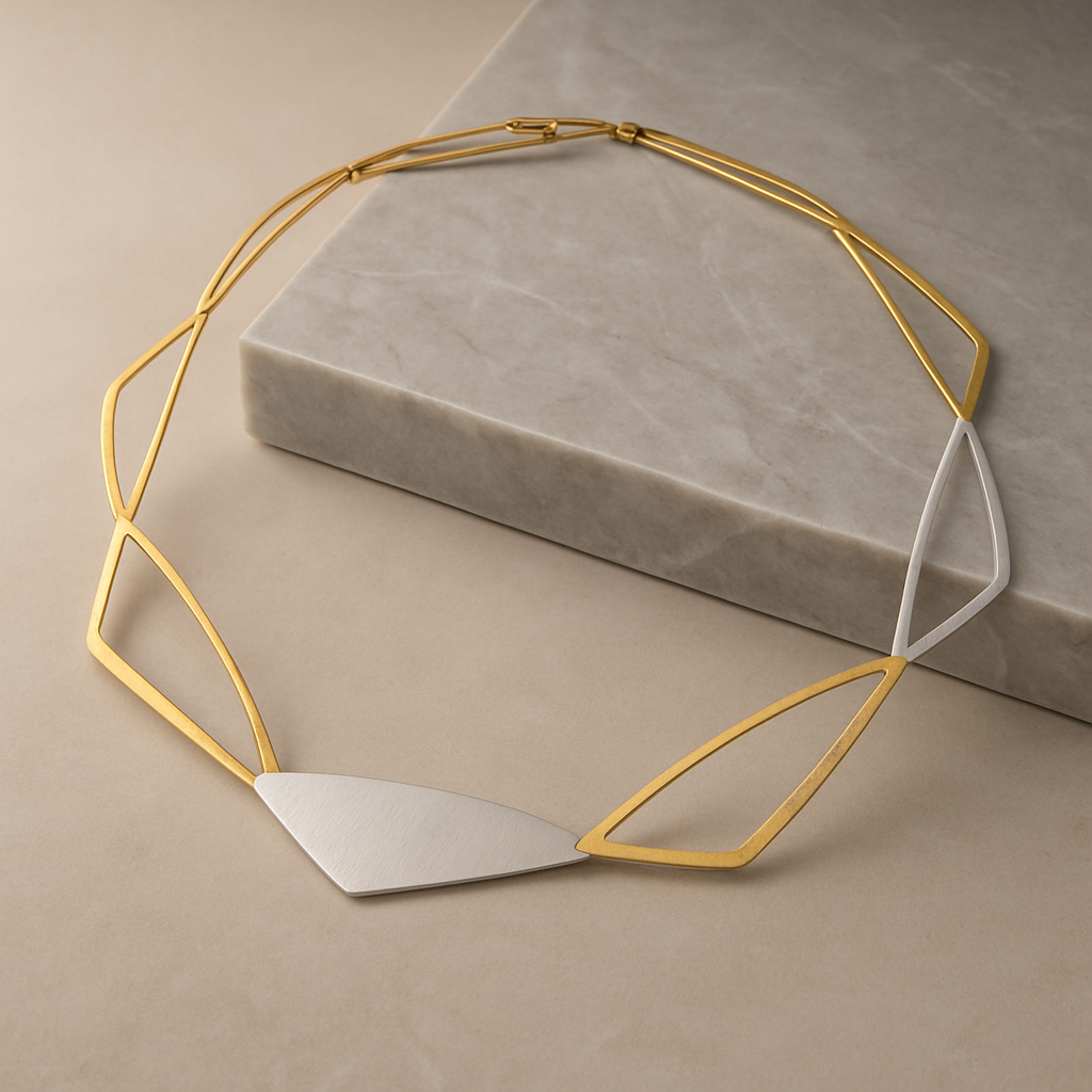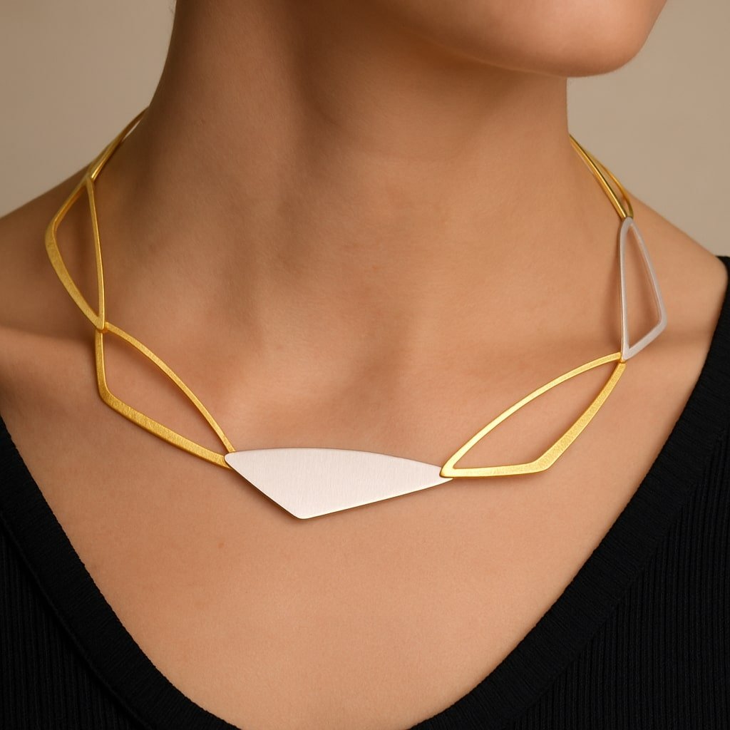 Make a bold yet refined impression with our Contemporary Silver and Gold Statement Necklace. Crafted with precision and care, this fixed-length piece combines the cool allure of sterling silver with the warm glow of satin gold tones, creating a harmonious balance of modern edge and timeless elegance.