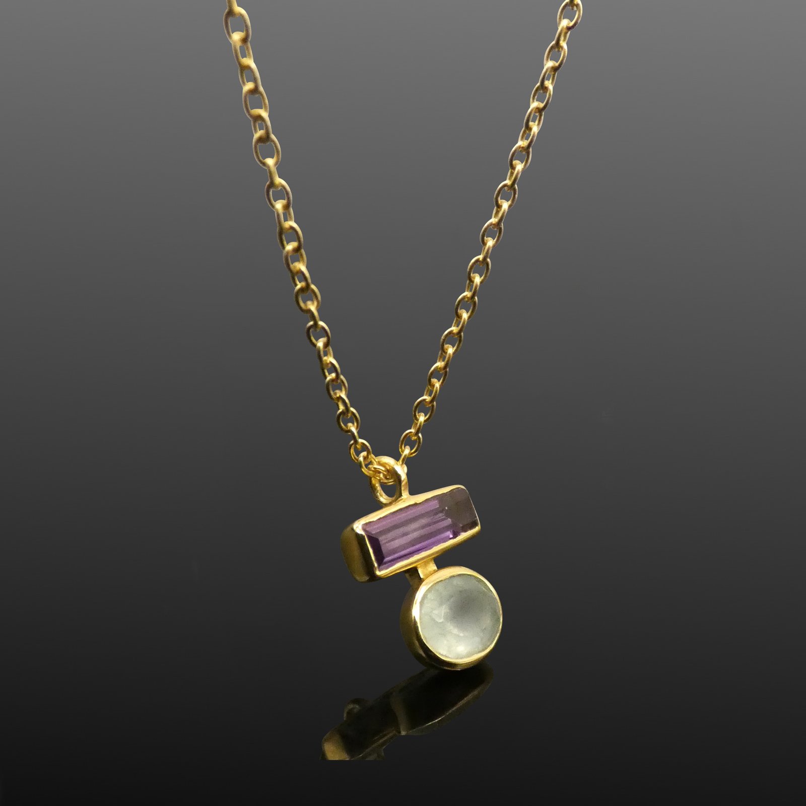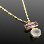 Bring a touch of colour and elegance to your look with this gold-plated sterling silver necklace, featuring delicate aquamarine and amethyst pendants. Thoughtfully designed, this piece pairs the soft, calming blue of aquamarine with the rich violet tones of amethyst, creating a beautifully balanced and eye-catching combination.
