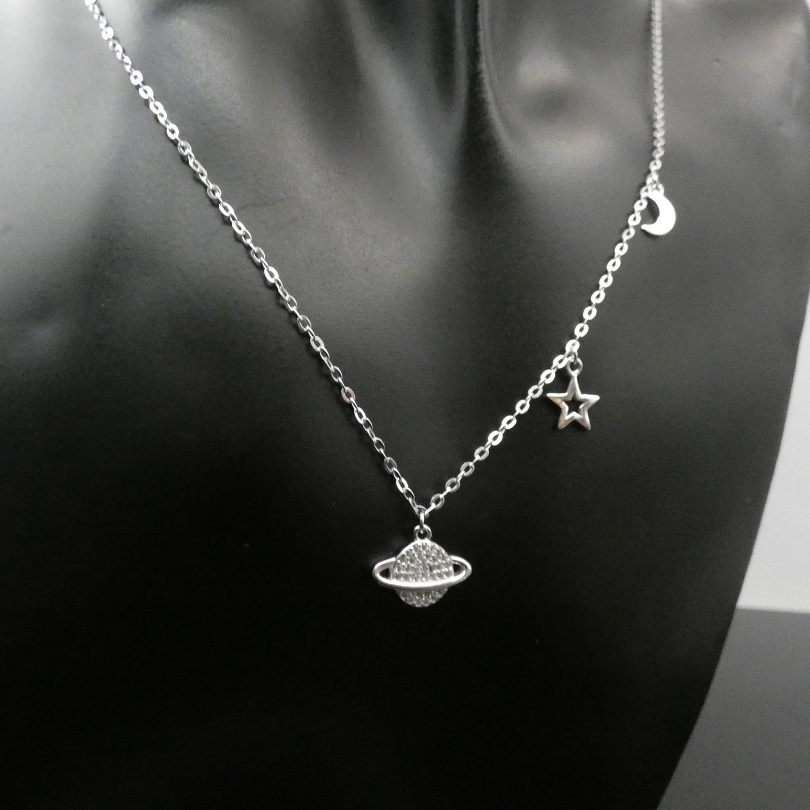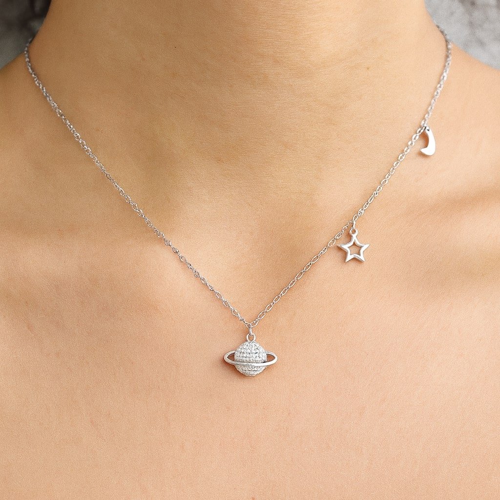 Celestial and quietly eye-catching, this sterling silver necklace from our Mojo collection features a detailed Saturn charm at its centre, flanked by a tiny star and crescent moon charm off to the side. It’s a subtle nod to the cosmos; perfect for stargazers, dreamers, or anyone drawn to the magic of the night sky.