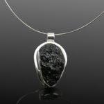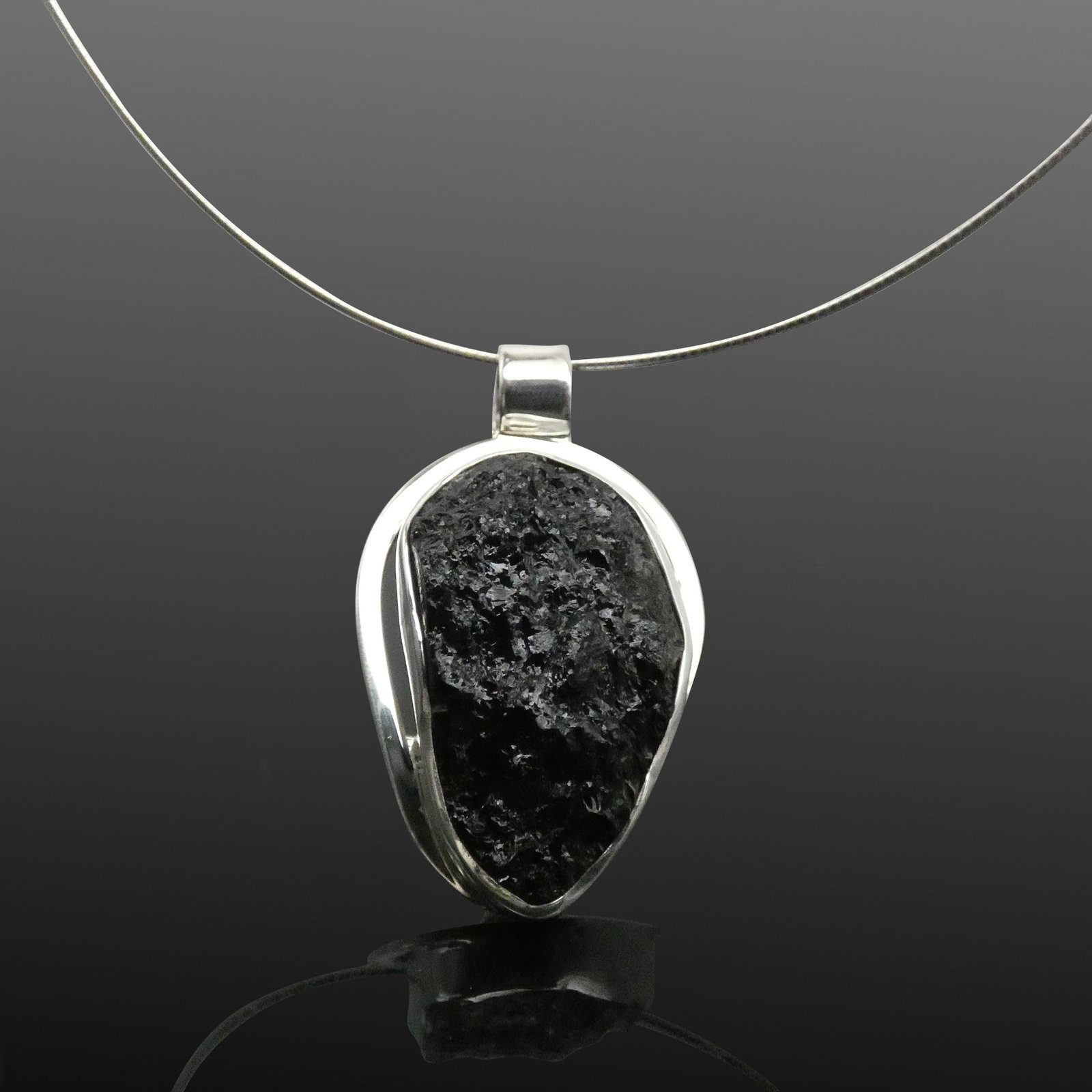 A one-of-a-kind sterling silver necklace featuring a raw Tourmaline stone pendant.