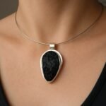 This sterling silver necklace features a raw black tourmaline stone in its natural, unpolished form. It has been exceptionally handcrafted for its frame to suit the natural ridges of the stone to perfection. Known for its striking texture and deep charcoal hue, each rectangular pendant has its own unique character, making every piece truly one of a kind.