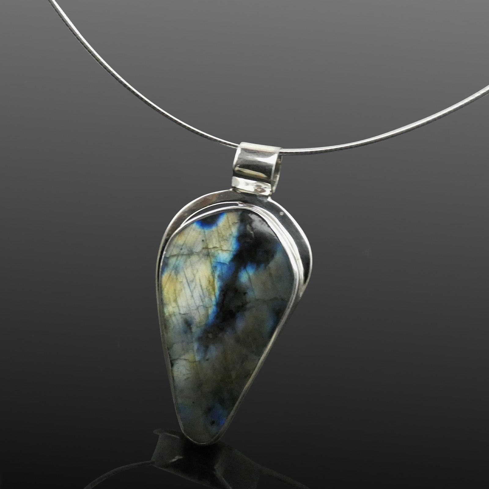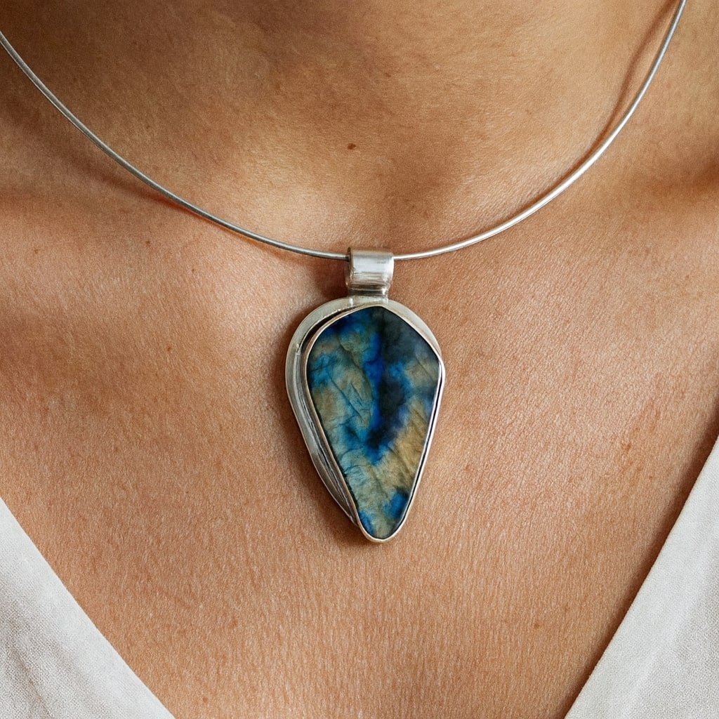 This gorgeous necklace has been hand-crafted for the frame to fit the natural Labradorite stone to perfection. Cut in a sleek rectangular shape, the stone reveals flashes of blue, green, and gold as it catches the light – a quiet but captivating detail that makes each piece feel truly special.