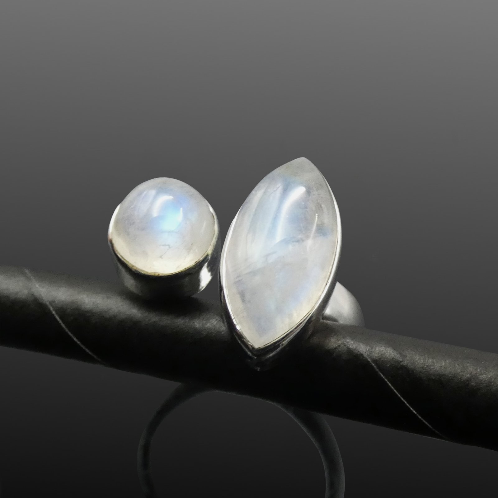 An elegant sterling silver ring with two gorgeous moonstones. This ring is adjustable.