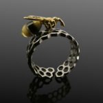 This unusual silver honeycomb ring will add a touch of whimsy and intrigue to any outfit. The handmade ring has been designed to look like honeycomb wrapping around the wearer’s finger, with a small amber bee sitting atop.
