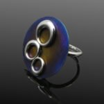 This bold statement ring is made from titanium and silver, the back of the ring is adjustable. The unusual combination of the silver circles against the colourful gradient background of the surrounding titanium creates an intriguing effect. The titanium is hypoallergenic and lightweight, making the bold piece comfortable to wear. Explore our titanium jewellery collection to find a matching necklace or earrings to complete the set. The centre of the ring has a diameter of approximately 25mm.